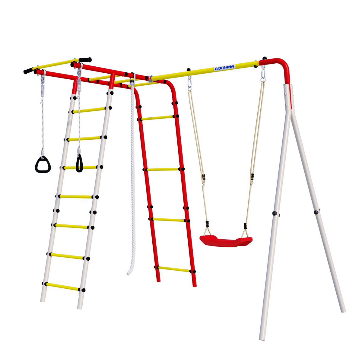Также имеется возможность дополнить базовую комплектацию модели другим навесным оборудованием: тарзанка, трапеция, лестница веревочная. Характеристики — Материал: металл — Габаритные размеры: 229 x 165,5 см — Высота: 210,5 см — Ширина ступеней - 49 cм Упаковка — 1 место: 144 x 36 x 19 см; 42,5 кг
