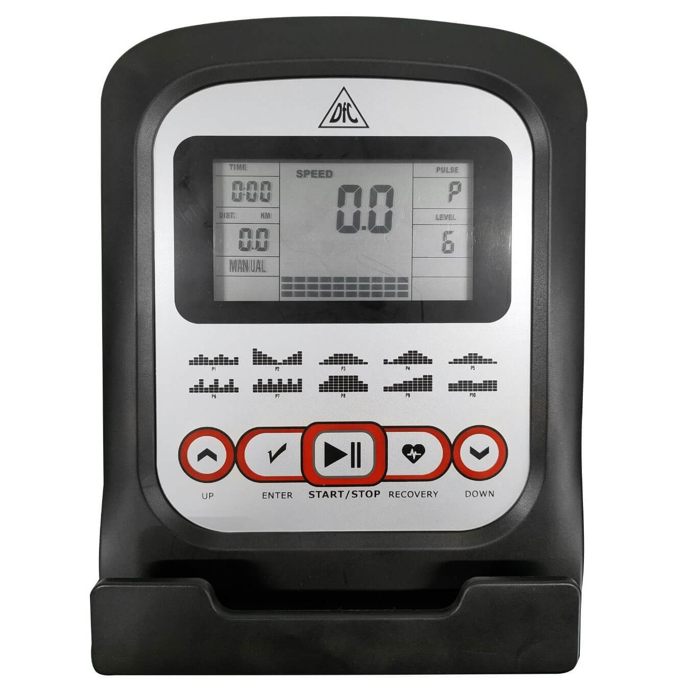 Пульс считывается сенсорными датчиками на поручнях и выводится на экран. Для дополнительного контроля можно приобрести нагрудный кардиодатчик + часы-монитор модели DFC W117.